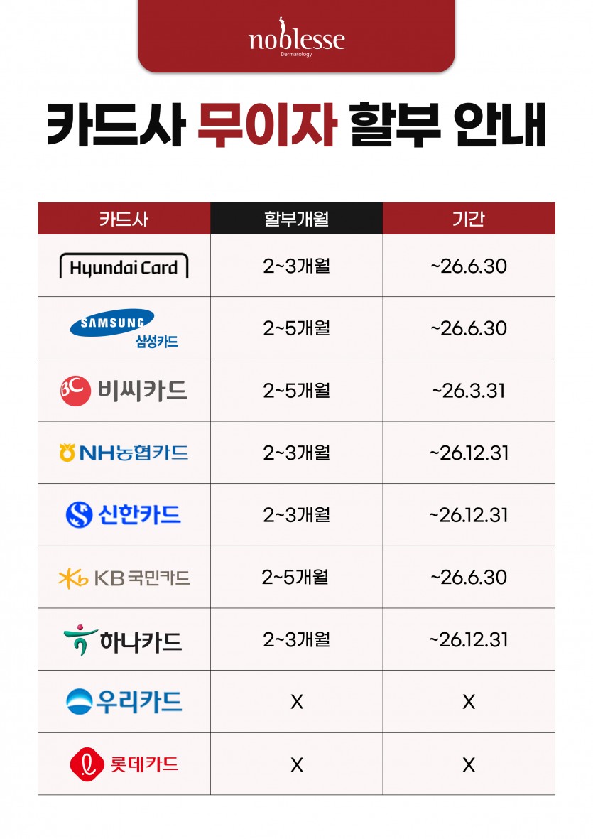 [노블레스피부과 카드사 무이자 할부 안내] 페이지 정보 작성자 노블레스피부과 댓글 0건 조회 931회 작성일 25-11-04 14:53 본문 [노블레스피부과 카드사 무이자 할부 안내] 목록 이전글[노블레스피부과 12월매거진] 25.12.03 다음글[노블레스피부과 10월 전문칼럼] 25.10.28 댓글목록 댓글목록 등록된 댓글이 없습니다.